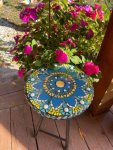 Inspired during the pandemic, Nancy started to create designs from glass pieces that were left over from other stained glass projects. Construction of the table top design is created on birch wood. Nancy’s tables combine opaque glass terrease that are cut and ground into individual designs. In some cases glass beads are used to enhance the design. Grout lines the surface and once dried is coated with a clear epoxy for outdoor & indoor durability. Table legs are either repurposed, sourced online or provided by customers. The tables range in size from 12 inches to 24 inches in diameter and can be used as side tables, plant stands or tables to enjoy a meal on.
