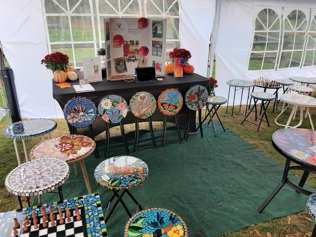 I have always loved creating artwork and have dabbled in many mediums, but love what you can create with glass. In the late 70’s I worked for a stained glass company in Richmond, creating imitation stained glass windows, planters and mirrors. Over the years I have taken many workshops working with glass, transforming it into stained glass windows, wind chimes, clocks, mirrors, stepping stones and plates. In my retirement I have been inspired to find another way to create with glass by making mosaic glass tables and garden wall art.