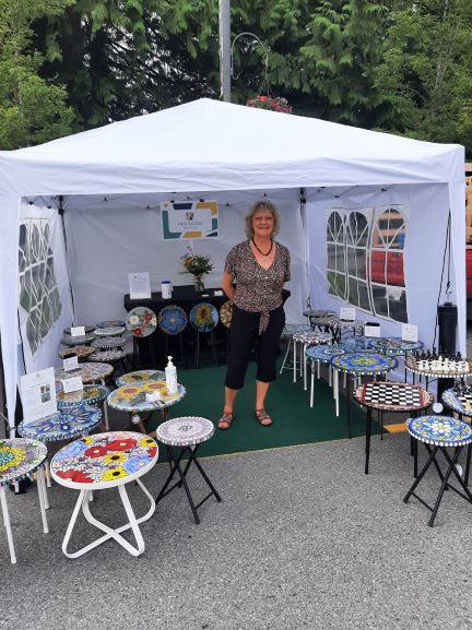 Nancy Plett is a Sunshine Coast Artist. You may see her work at some local markets from April to September, The Sechelt Farmers and Artisan Market from April to September, at the Gibsons Artisan Market in July and August and the Sunshine Coast Art Crawl in October. This year Nancy will part of the Purple Banner Tour on the Sunshine Coast and will have her mosaic table and wall art available to view by appointment at her home art studio starting in May.
