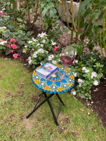 ” I originally bought the table for outside use on my back patio. Instead, it has become and inside table. During the pandemic we started playing Canasta ( foursome card game) with my brother and his wife. There wasn’t room on our card table for snacks, drinks or the score card so we used the mosaic table. When it is not being used for card games it stays in the sun room and holds one of my many plants. I love it!