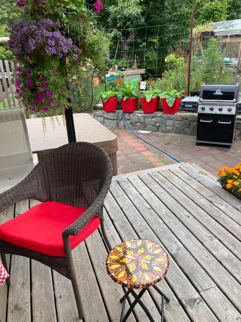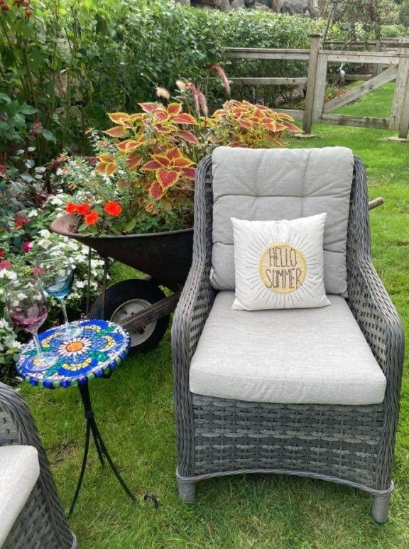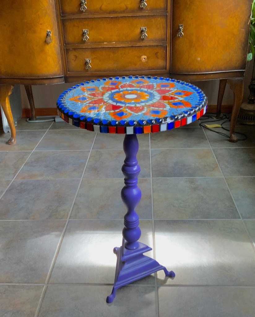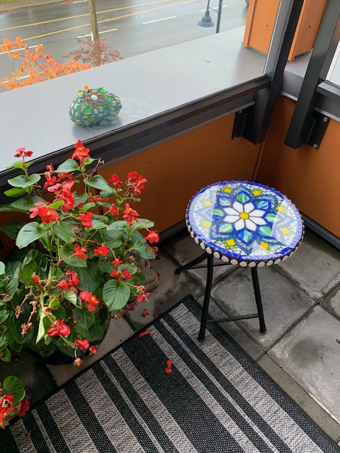 “Our yard is very colourful this summer and your table adds to the colour. We have a covered area outside that has been a real joy and godsend during Covid. I plan to move my mosaic table indoors later in the fall.”